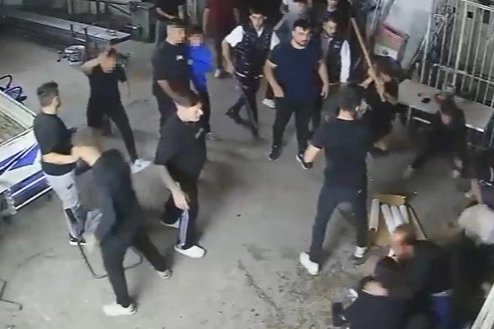 Konya'da bir iş yerine gelen çoğu çocuk yaştakilerden oluşan grubun, iş yeri sahibi iki kardeş ile sopa, kürek ve tüfekle meydan savaşını andıran kavga anı güvenlik kamerasına yansıdı.