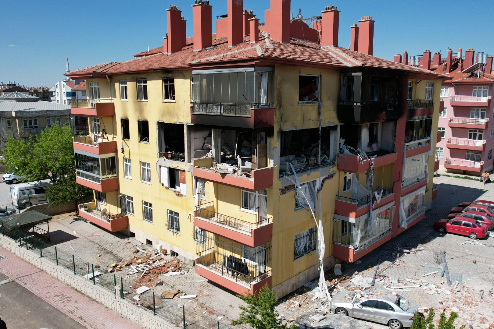 Konya'da apartmanda yaşanan doğalgaz patlaması ve sonrasında çıkan yangında ortaya çıkan hasar, çekilen gündüz görüntülerinde göz önüne serildi.