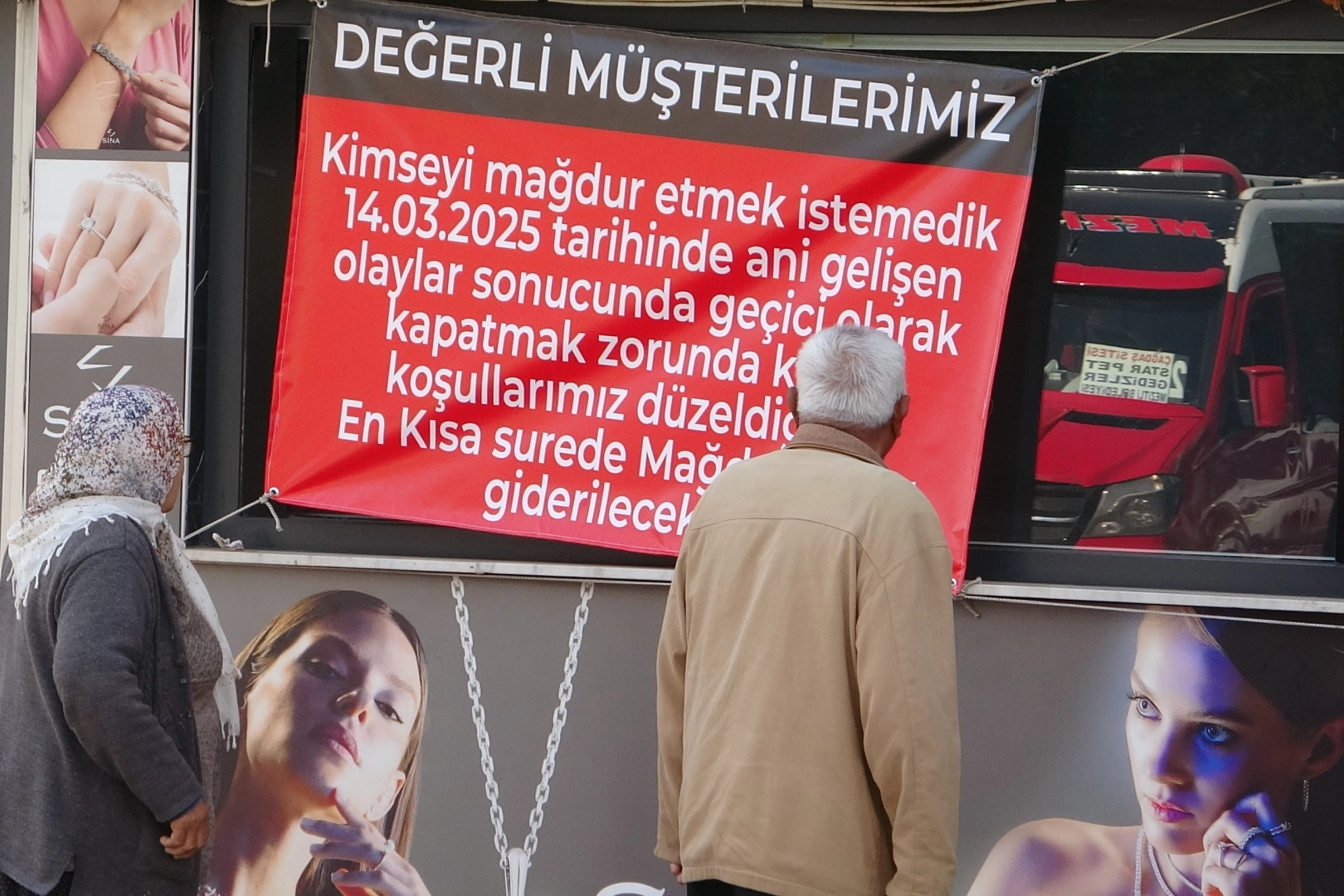 Mersin'de 116 müşterisinden yaklaşık 120 milyon lira vurgun yaptığı iddia edilen 2 müdürüyle birlikte tutuklanan kuyumcunun, "Kimseyi mağdur etmek istemedik, koşullarımız düzeldiği an en kısa sürede mağduriyetler giderilecektir" yazılı pankartla cevap vermesi dikkat çekti.