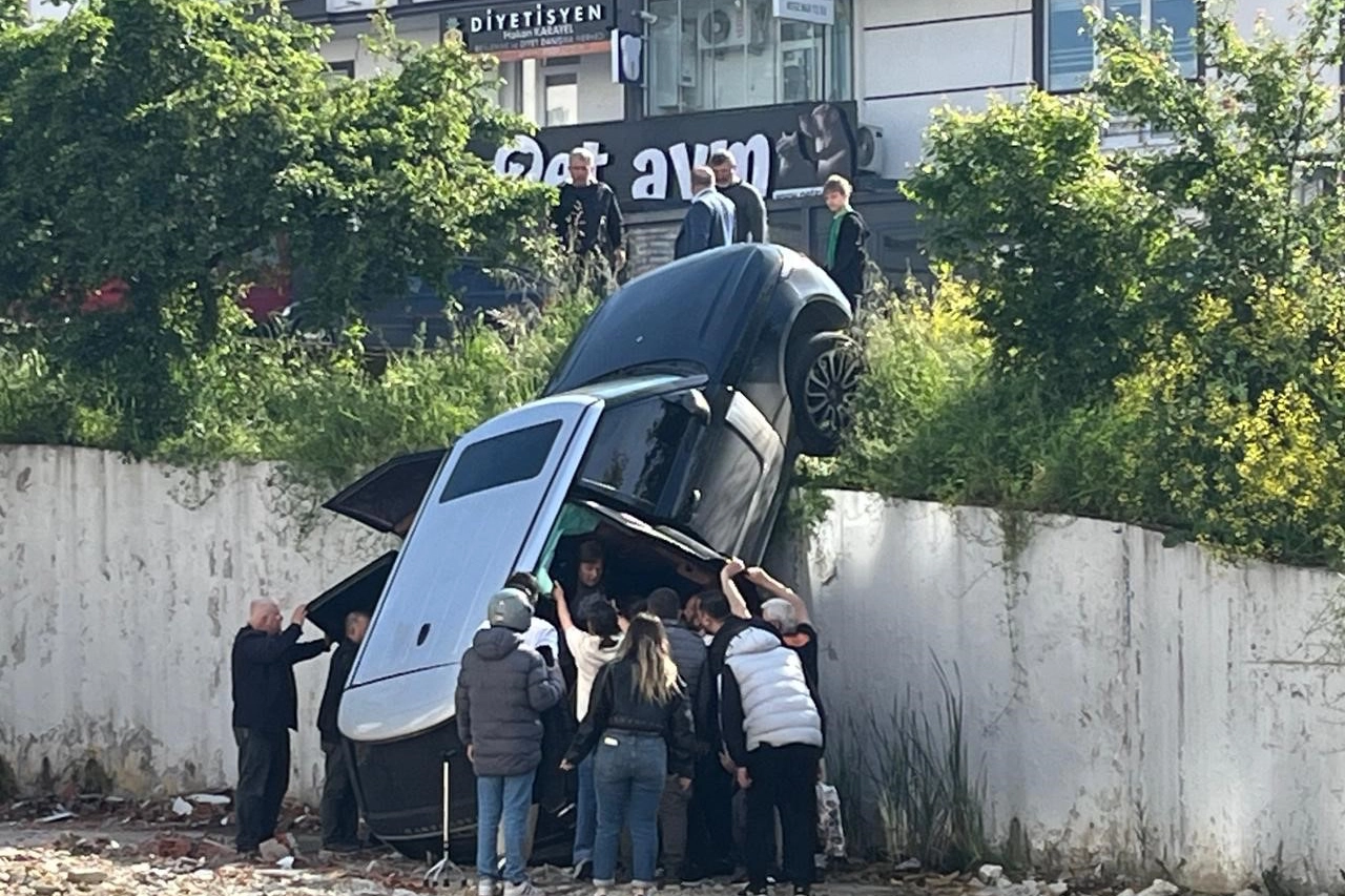 Samsun'da rampa aşağı geri geri kaçan lüks cipin istinat duvarından düşerek asılı kaldığı kazada 2 kadın yaralandı.