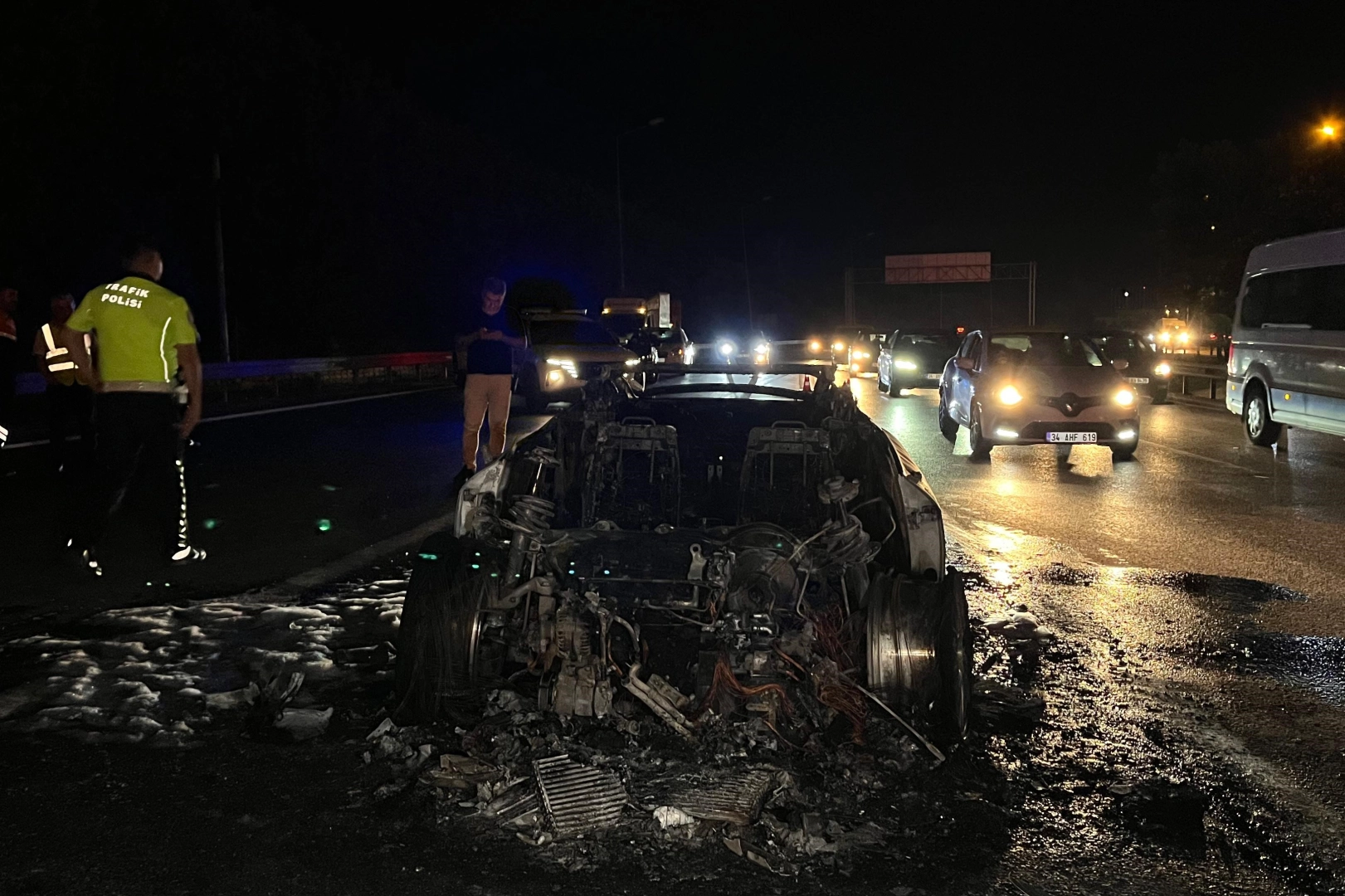 "Yaklaşık 2 milyon TL bir zararımız var" Olay ile ilgili konuşan sürücü Ümit Kartal, "Olay bir anda oldu. Aracımla seyir halindeyken motor kısmında bir ses duydum. Aracı sağa çektim. Evcil hayvanım korkmasın diye onu bagaja koydum. Sonrasında kaputtan çıkan alevleri görünce apar topar bagajdan yangın söndürme tüpünü aldım. Bu şekilde müdahale ettik. Duran arabalar yardıma koştu. Her şey 10 dakika içerisinde olup bitti. Arabada herhangi bir problem yok. Bakımlarını zamanında yaptırdım. Birdenbire oldu. Nazar çıktı diyelim. Bize bir şey olmadı. Yardım eden herkesten Allah razı olsun. Bir anda 15 kişi yangına müdahale etti ama kurtaramadık. Arıza tespiti yapacak bir hal yok araçta. Ekipler de hızlı bir şekilde geldi. Hepsine teşekkür ediyorum. Yaklaşık 2 milyon TL bir zararımız var" dedi.