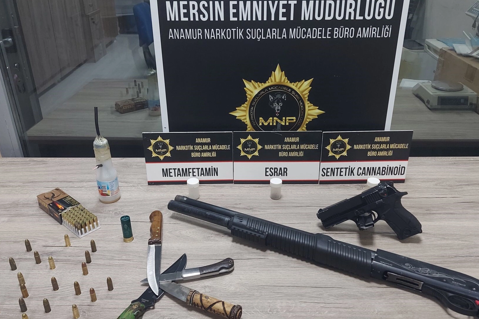 Alınan bilgiye göre, İl Emniyet Müdürlüğü Anamur Narkotik Suçlarla Mücadele Büro Amirliği ekipleri, uyuşturucu ile mücadele çerçevesinde çalışma yaptı. Anamur Cumhuriyet Başsavcılığı koordinesinde yapılan çalışmada belirlenen bir otomobildeki şüpheliler A.A. ile A.K. gözaltına alındı. Şüphelilerin otomobil ile evlerinde yapılan aramada çeşitli miktarlarda esrar, sentetik kannabinoid, metamfetamin, bong, 1'er adet tüfek ve tabanca ile çeşitli suç aletleri ele geçirildi.