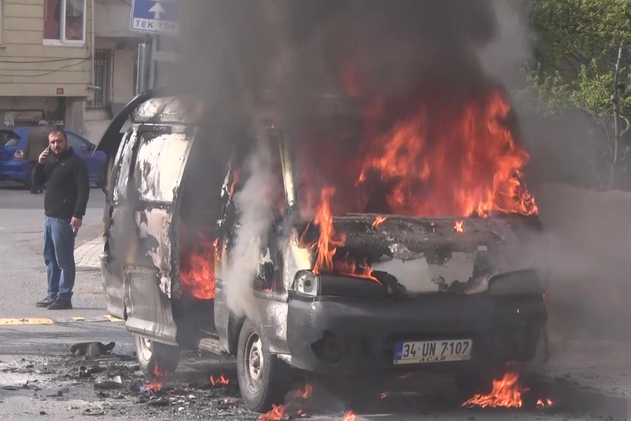 İstanbul Ataşehir'de park halindeki bir minibüs alev alev yandı.