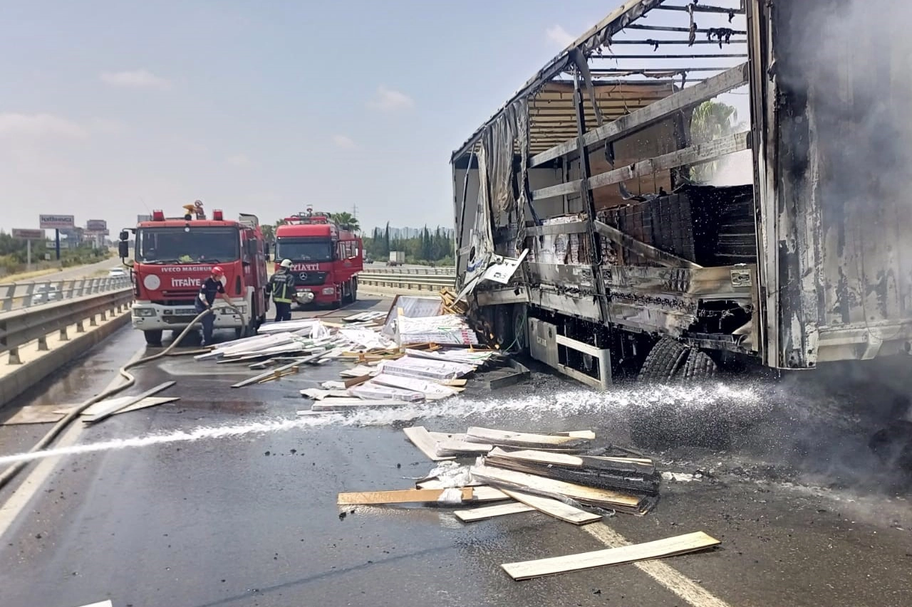 Antalya’da mobilya malzemesi yüklü tır seyir halindeyken yandı.