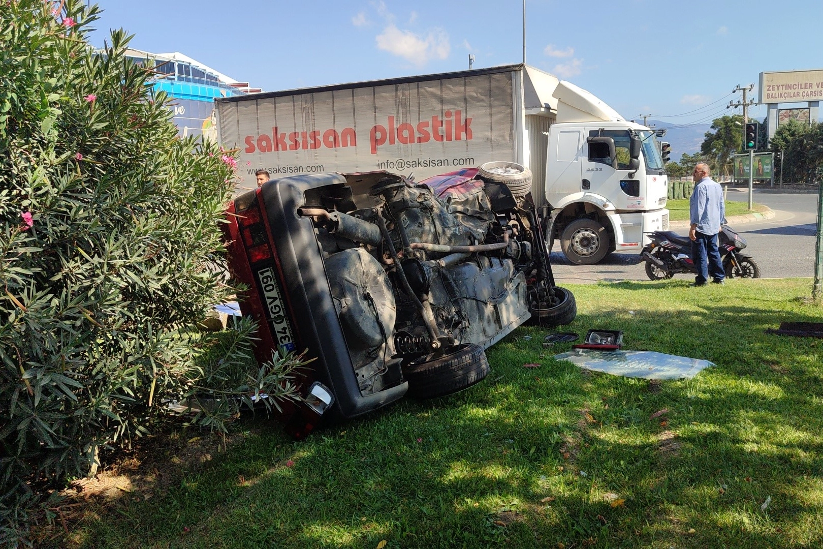 Savrulan otomobil takla atarak refüjde bulunan tabelalara çarptıktan sonra ters döndü.