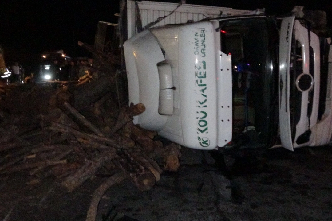 Antalya'nın Manavgat ilçesinde odun yüklü kamyon, kırmızı ışıkta duran otomobile çarparak devrildi.