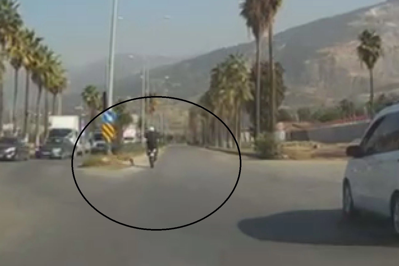 İskenderun - Payas E5 karayolu Liman mevkiinde bir motosiklet sürücüsü, ışıklardan kalkışıyla adeta yarışçıya dönüştü.
