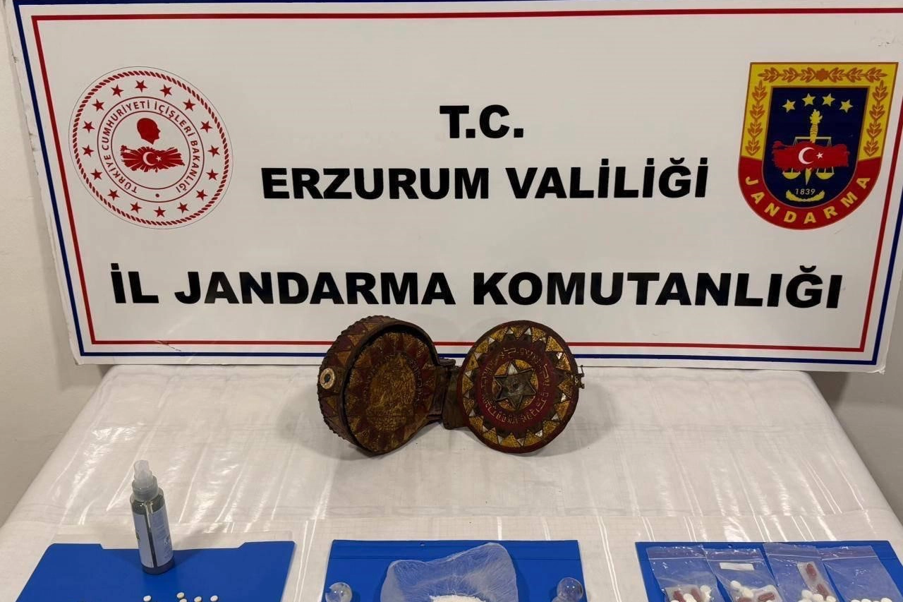 Erzurum İl Jandarma Komutanlığı ve Çat Cumhuriyet Başsavcılığı koordinesinde yapılan çalışmalar neticesinde; 31 Mart 2026 tarihinde Çat ilçesi yol kontrol noktasında uyuşturucu madde taşıyabileceği değerlendirilerek durdurulan araç içerisinde bulunan 2 şahsın üzerinde ve eşyalarında yapılan aramada; 132 gram bonzai ham maddesi, 41 gram metamfetamin, 5 gram eroin, 82 adet sentetik ecza hap, 18 adet captagon hap, 2 adet uyuşturucu kullanma aparatı ve 1 adet ceylan derisi üzerine yazılmış altın işlemeli Tevrat ele geçirildi.