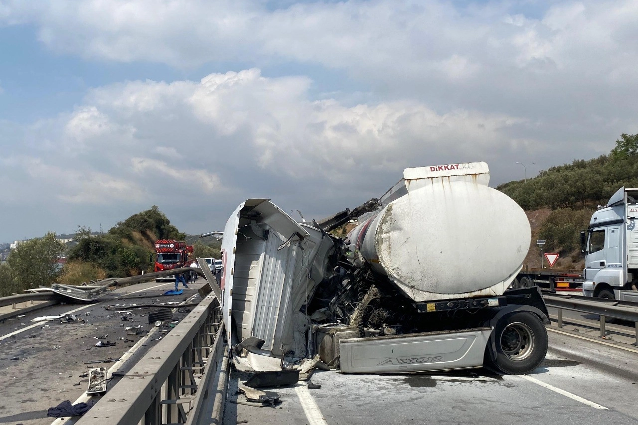 Kocaeli'nin Dilovası ilçesi D100 geçişinde, sürücüsünün kontrolünü kaybettiği tanker, bariyerlere dalarak makasladı.