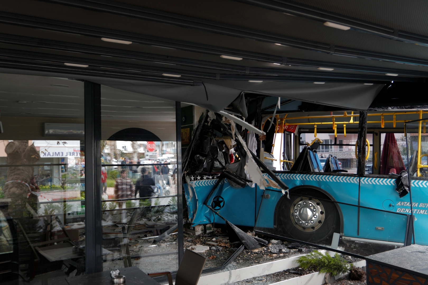 Park halindeki araçlara çarptıktan sonra hareket etmeye devam eden halk otobüsü, sokak girişinde bulunan bir kafeteryaya daldı. Büyük bir gürültüyle işyerine giren otobüsü son anda fark eden işyeri çalışanları ve müşteriler kendini dışarı attı. Çevredeki vatandaşların ihbarı ile olay yerine çok sayıda sağlık, polis ve itfaiye ekibi sevk edildi. Büyük panik yaşanan kazada işletme içerisinde bulunan 2 kişi ve halk otobüsü sürücüsü yaralandı.