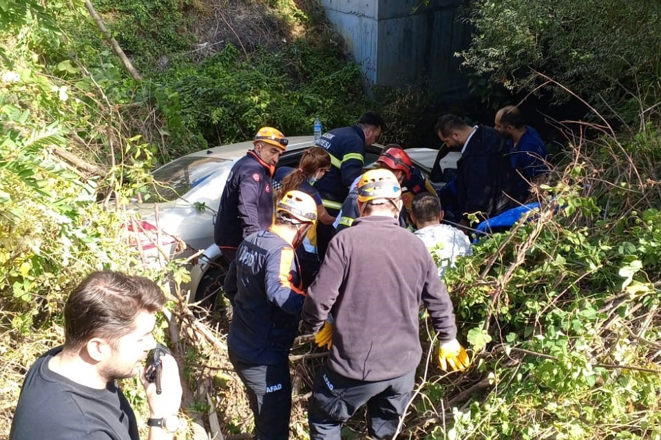 Bilecik'te seyir halindeyken bir tekerleğinin fırlaması sonucu kontrolden çıkan otomobil dere yatağına uçarken 1'i ağır 2 kişi yaralandı.