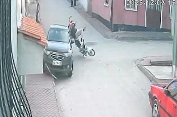 Güvenlik kamerasına saniye saniye yansıyan kazada, motosiklette bulunan 2 kişi havada taklalar attıktan sonra yere düştü.