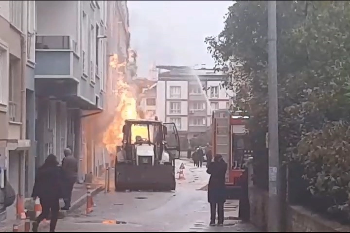 Binaların hemen dibinde meydana gelen olayda iş makinesi, bir anda alev topuna dönerken, mahalleli de büyük panik yaşadı. Vatandaşların ihbarıyla olay yerine 112 İtfaiye ve 187 Doğalgaz Acil ekipleri sevk edildi.