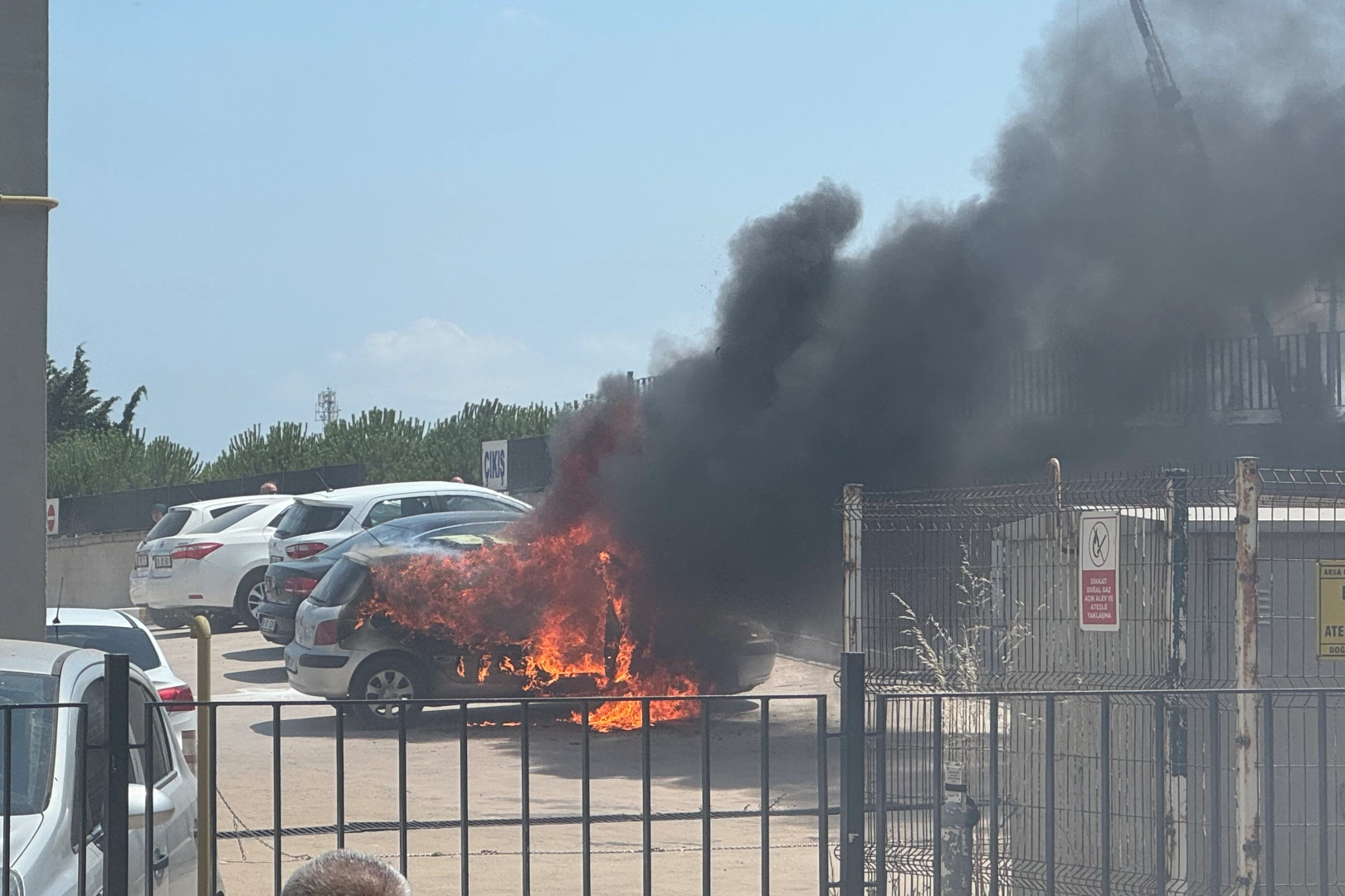 Balıkesir'in Bandırma ilçesinde hastane otoparkında park halinde bulunan otomobil alev aldı.