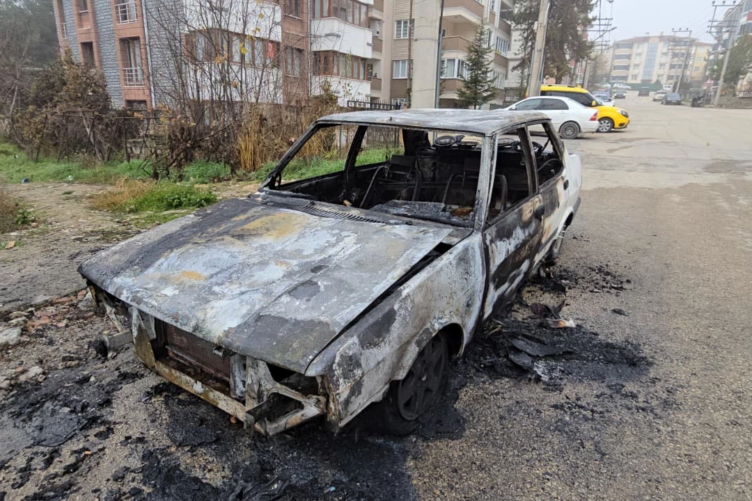 Karabük'ün Safranbolu ilçesinde park halindeyken alev alan ve tamamen yanarak kullanılmaz hale gelen otomobilden geriye yalnızca demir yığını kaldı.