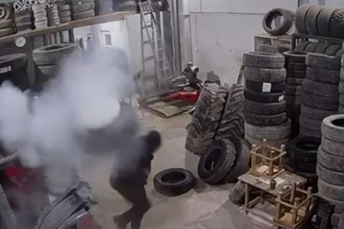 Olay sırasında iki çalışan, bir aracın lastiğini tamir edip şişirmeye çalışıyordu. Patlama, iş yerindeki güvenlik kameralarına saniye saniye yansıdı. Görüntülerde, lastiği şişirmeye çalışan çalışanların bir anda yaşanan patlamakarşısında hızla geri çekildikleri görülüyor.