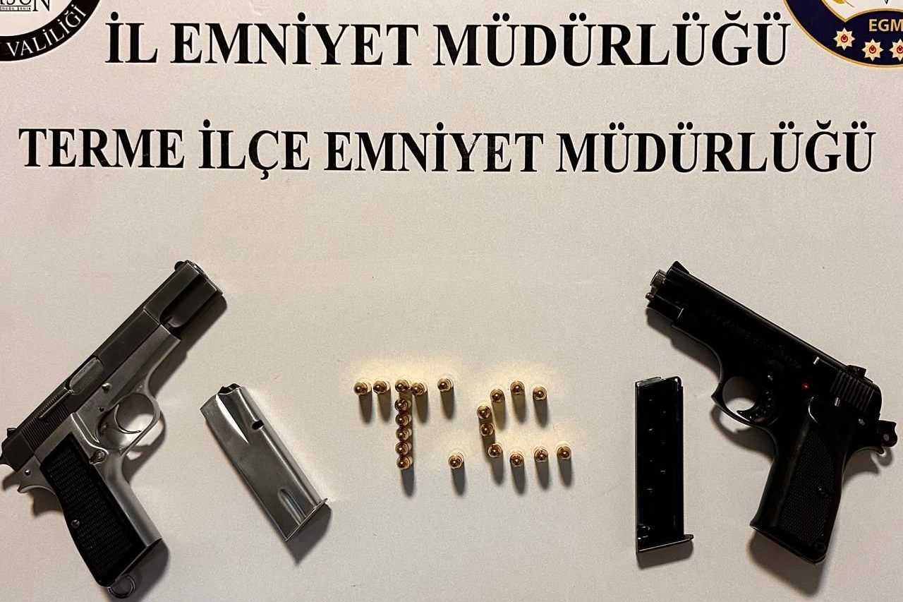 Edinilen bilgiye göre, Samsun'un Terme ilçesinin Yalı Mahallesi'nde polis tarafından şüphe üzerine park halindeki bir araçta bulunan E.O. (25) ve C.A. (27) isimli şahısların yapılan üst aramalarında 2 adet ruhsatsız tabanca ve 20 adet tabanca fişeği ele geçirildi. Yakalanan şahıslar hakkında adli işlem başlatıldı.