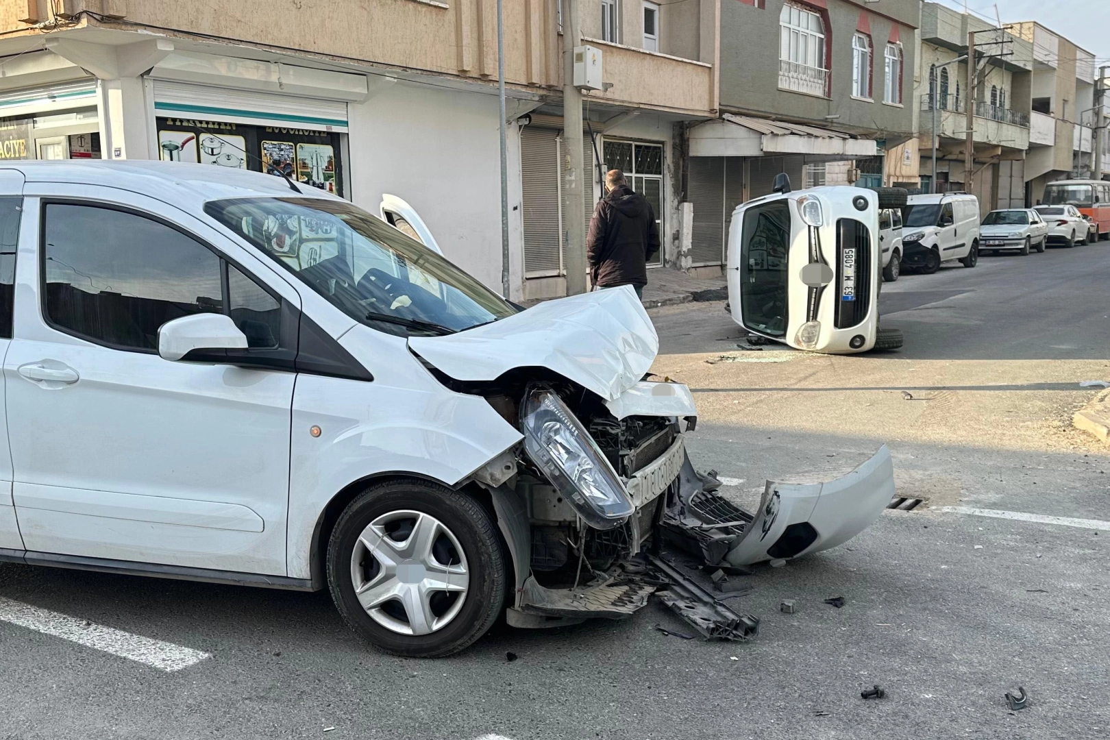 Şanlıurfa'nın Ceylanpınar ilçesinde meydana gelen kazada çarpışan iki hafif ticari araçtan biri ters döndü.