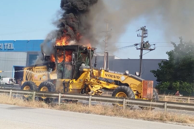 Sakarya D-100 kara yolunda yolda seyir halindeyken alev topuna dönen Hendek Belediyesi'ne ait greyder, itfaiyenin müdahalesiyle söndürüldü.