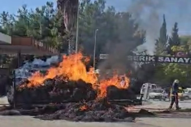 Antalya’nın Serik ilçesinde seyir halindeki traktörde bulunan saman balyaları yanarak küle döndü.