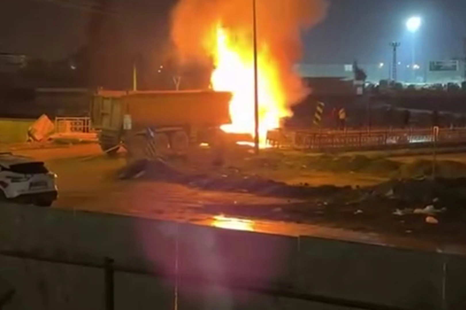 Hatay'da seyir halindeyken alevlere teslim olan hafriyat kamyonunda yaşanan patlama kameraya yansıdı.