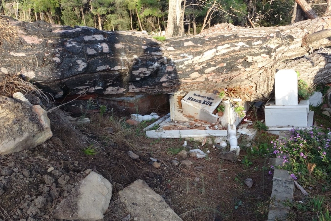 Manavgat’ta 2 gündür etkili olan şiddetli fırtına günlük yaşamı olumsuz etkiledi. D-400 Karayolu’nda ağaçların dallarının yola savrularak trafiğin aksamasına neden olan fırtına, Side Limanı’nda da teknelerin batmasına neden oldu. Ulukapı Mahallesi Mezarlığı’nda şiddetli fırtınanın kökünden söktüğü dev çam ağacı bazı mezar taşlarının kırılmasına, bazı mezarların da olduğu yerde çökmesine ve yan yatmasına neden oldu. Zarar gören mezarların, yıkılan çam ağacının kaldırılmasının ardından sahipleri tarafından tamir edilmek suretiyle eski haline getirileceği belirtildi.