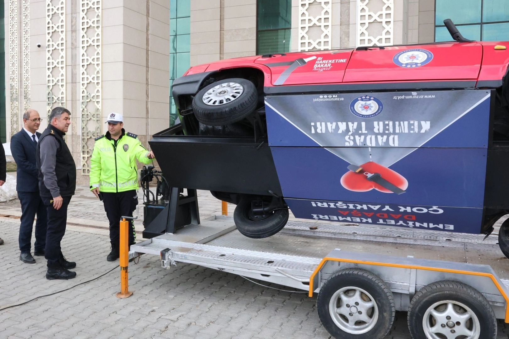 Erzurum İl Emniyet Müdürü Onur Karaburun, Trafik Denetleme Şube Müdürlüğü tarafından emniyet kemeri kullanımının hayati önemine dikkat çekmek amacıyla hazırlanan simülasyon aracını yerinde inceledi.
