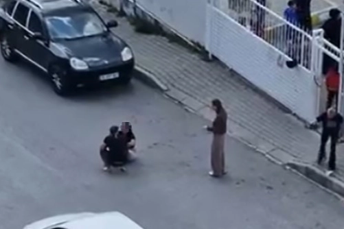 İzmir'in Bornova ilçesinde bir kişi, sokak ortasında okuldaki çocukların gözü önünde karısını darbetti.
