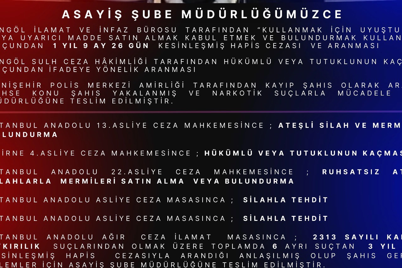 Bingöl’de polis ekipleri arama kaydı bulunan şahıslara göz açtırmıyor. Bu çerçevede haklarında çeşitli suçlardan 1 yıl 9 ay 26 gün ve 3 yıl 5 ay kesinleşmiş hapis cezası bulunan 2 kişi yakalandı. Şahısların emniyetteki işlemlerinin devam ettiği belirtildi.