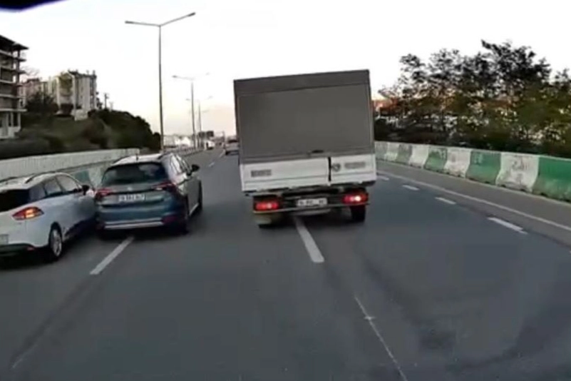 Seyir halindeki başka bir araç sürücüsü sol şeritte kalan aracı görünce hem refleks, hem de takip mesafesinin farkıyla kazayı ucuz atlattı. O anlar kameraya anbean yansıdı.
