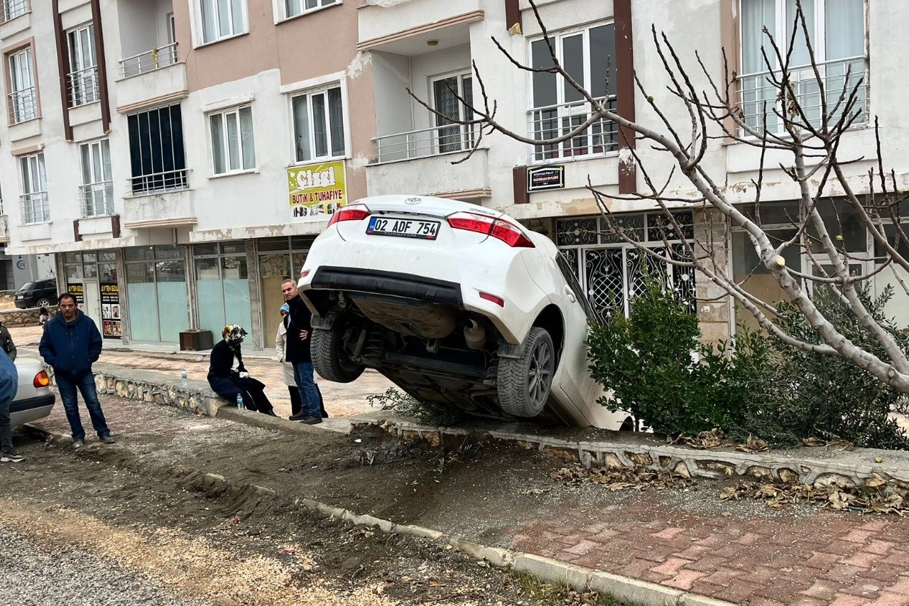 Adıyaman’ın Besni ilçesinde sürücüsünün hakimiyetini kaybettiği otomobil apartman boşluğuna düştü.