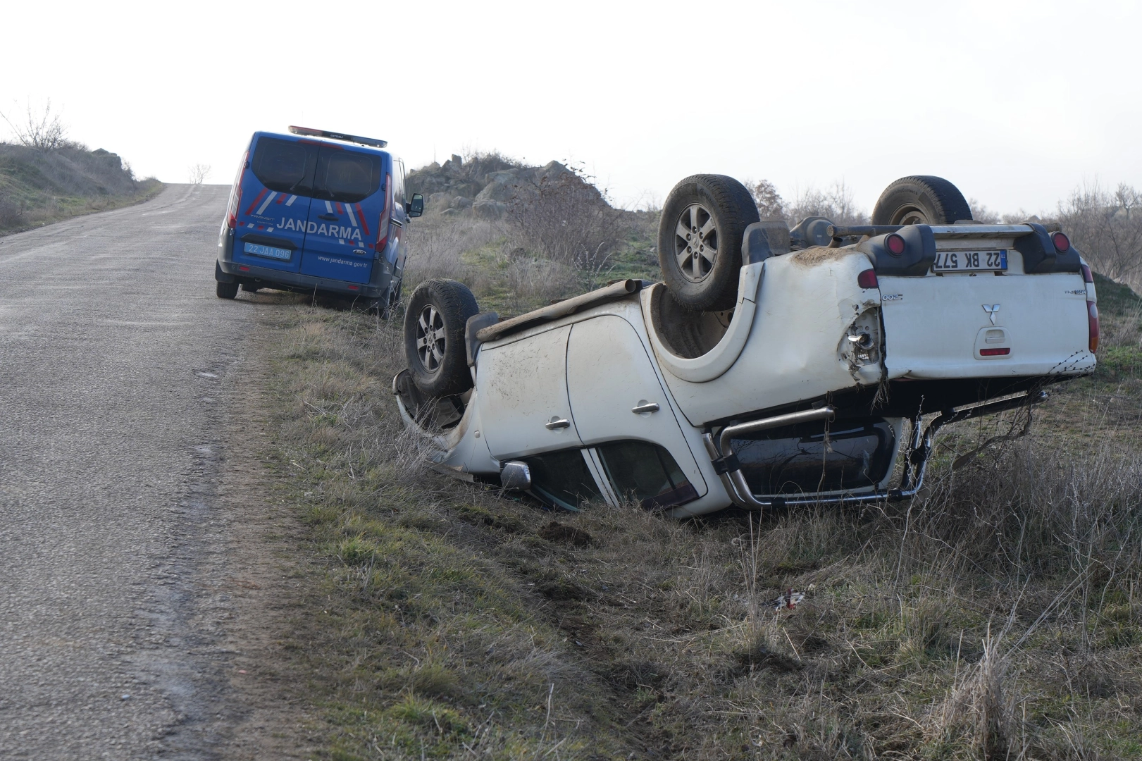 Edirne’de yoğun sis sebebiyle görüş mesafesi düşen pikap sürücüsü direksiyon hakimiyetini kaybederek takla atıp ters durdu.