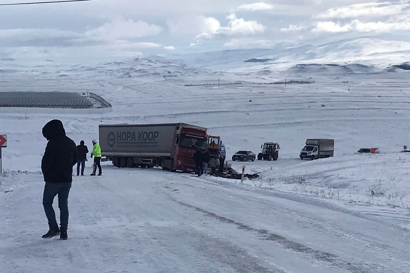 Kaza, sabah saatlerinde Hanak- Damal karayolunun 3. kilometresinde meydana geldi. Sürücüsü ve plakalı öğrenilemeyen tır, kar ve buzlanma nedeniyle kayganlaşan yolda kayarak yolu trafiğe kapattı.