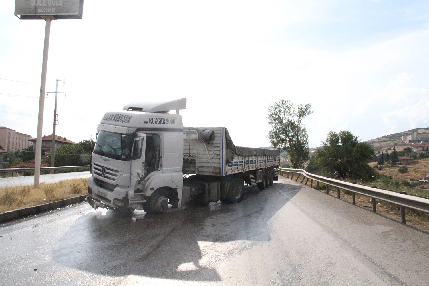 Yağışlı havanın da etkisiyle kayganlaşan yolda kontrolden çıkan tır, karşı şeride geçerek yolu kapattı. Trafik akışının bir süre kapalı kaldığı kazada şans eseri yaralanan olmadı.