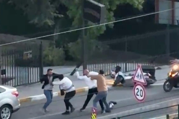 Yumrukların havada uçuştuğu kavgada, taraflar birbirine kask ve bıçakla saldırdı. O anlar cep telefonu kamerasına yansıdı.