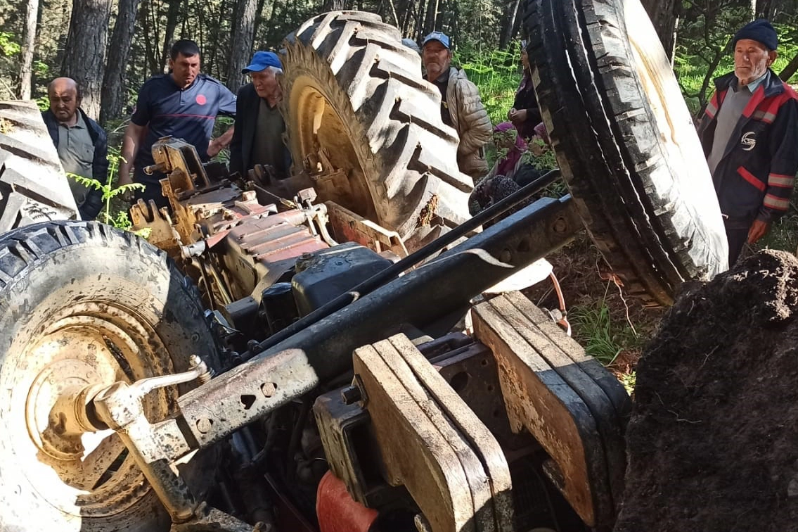 Balıkesir'in Sındırgı ilçesinde direksiyon hakimiyetini kaybeden sürücünün traktörü ters döndü.