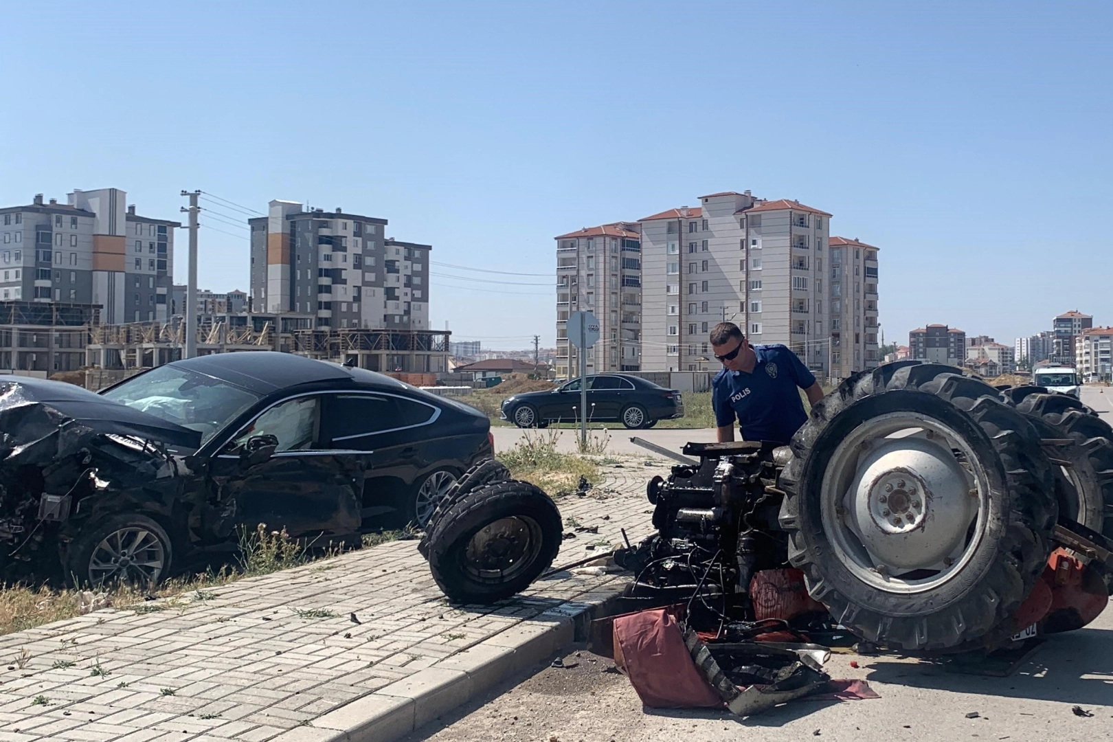 Karaman'da otomobil ile çarpışan traktör paramparça oldu.
