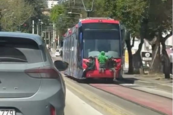 Hareket halindeki tramvayın arkasına tutunan çocuklar metrelerce bu şekilde ilerledi. Çocukların tehlikeli yolculuğunu gören vatandaşlar duruma tepki gösterirken, kimilerine bu görüntüler 'pes' dedirtti. Herhangi bir olumsuzluk yaşanmadan tramvaydan ayrılan çocuklar gözden kayboldu.