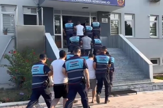 Aydın'ın Didim ilçesinde tur otobüsünün önünü keserek, aracın camlarını kırdığı iddia edilen 5 şüpheli, jandarmadaki işlemlerinin ardından adliyeye sevk edildi.