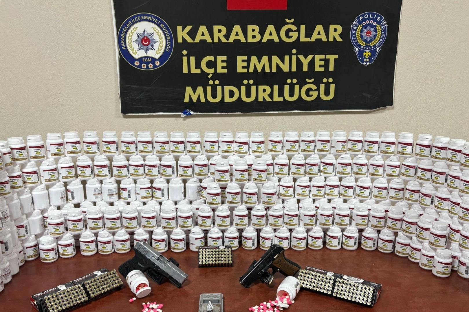 Karabağlar İlçe Emniyet Müdürlüğü Suç Önleme ve Soruşturma Büro Amirliği ekipleri, M.A.'nın (24) ilçede uyuşturucu madde ticareti yaptığını belirleyerek harekete geçti. Uyuşturucu madde kullanımı ve ticaretinin yanı sıra hırsızlıktan da suç kaydı olduğu belirlenen M.A., kısa sürede yakalanırken, sattığı uyuşturucu maddelerin bir dükkanda muhafaza edildiği belirlendi. Adreste yapılan aramada, 13 bin 776 adet uyuşturucu nitelikli sentetik hap, bir miktar esrar maddesi, 1 hassas terazi ile 2 ruhsatsız tabanca ve 500 fişek ele geçirildi. Gözaltına alınan M.A., sorgulanmak üzere emniyete götürüldü.