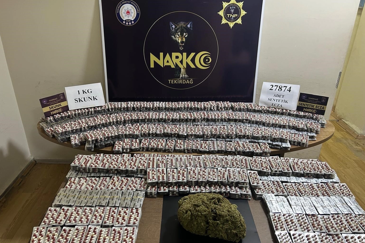 Tekirdağ’ın Çorlu ilçesinde düzenlenen operasyonda 27 bin 874 sentetik hap ve 1 kilogram skunk ele geçirildi, A.K.K. isimli şahıs tutuklandı.