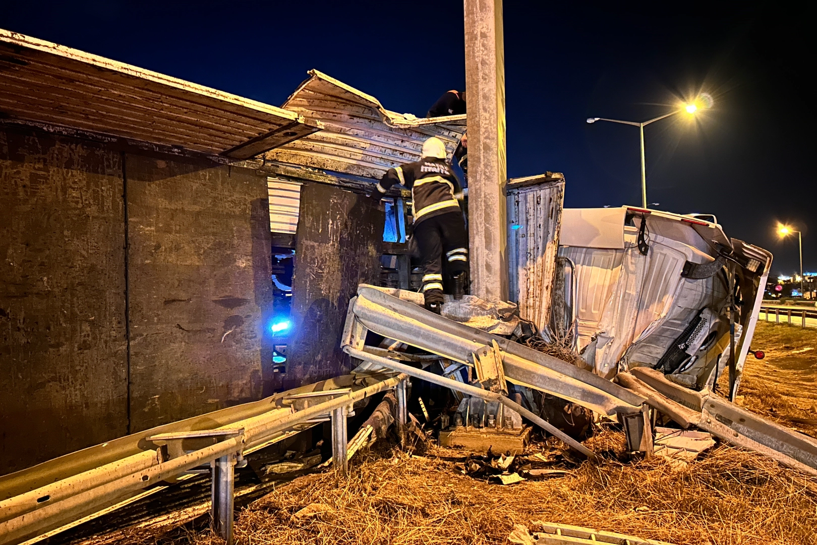 Hatay’da kontrolden çıkarak orta refüje çarpan ve devrilen tırdaki 2 araç yola savruldu, tır sürücüsü yaralandı.