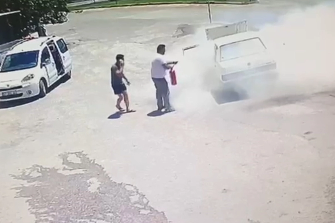 Antalya'nın Serik ilçesinde Tofaş marka otomobilde çıkan yangın esnasında aracın LPG'li olduğunu öğrenen esnaf, alevleri söndürmek için kullandığı yangın tüpleri boş çıkınca büyük panik yaşadı. Yaşananlar güvenlik kamerası tarafından anbean kaydedildi.