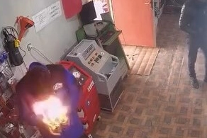 Yüzü kısa süreliğine alevler arasında kalan çalışan, sprey kutusunu yere attı. Kısa bir şokun ardından kendine gelen çalışan, yerde yanan sprey kutusunu alarak dışarı attı. O anlar kameralara yansıdı.