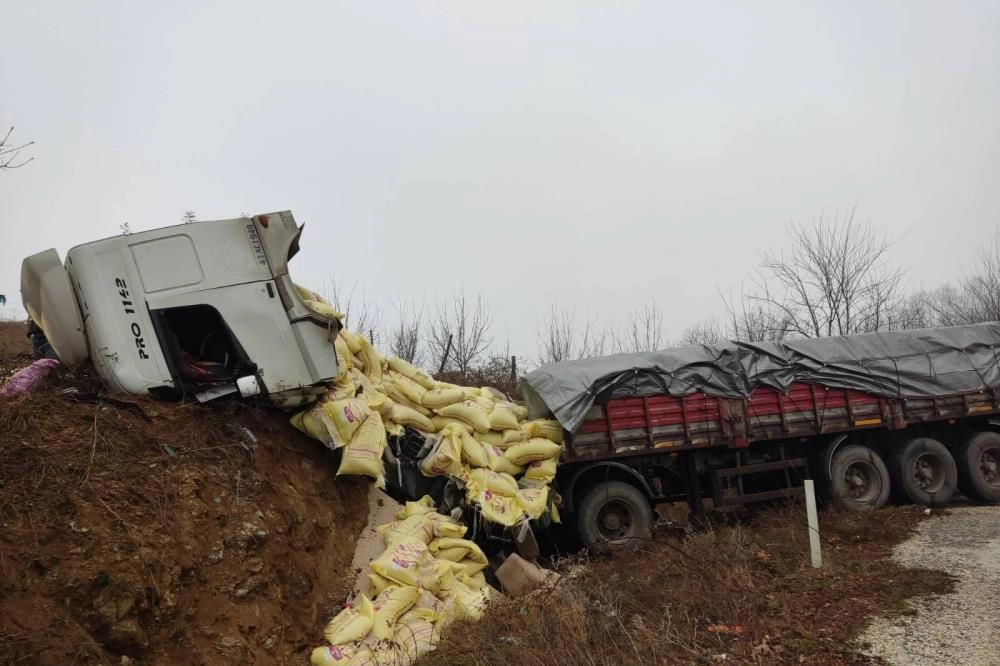 Kaza Bursa'nın İnegöl ilçesi ile Bilecik'in Pazaryeri ilçesini bağlayan yolda meydana geldi. Pazaryeri ilçesinden İnegöl'e seyreden sürücü Özgür Ö.(24) idaresindeki 43 ACJ 949 plakalı yem yüklü tırın iddiaya göre frenleri patladı. Yokuş aşağı kontrolden çıkan tır, yamaca çarparak durabildi. Kaza sonucu sürücü ile yanındaki yolcu Salih C.(25) yaralandı, yemler etrafa saçıldı. Yaralılar kaza yerine sevk edilen ambulansla İnegöl Devlet Hastanesi'ne kaldırıldı. Jandarma komutanlığı ekipleri kazayla ilgili soruşturma başlattı.
