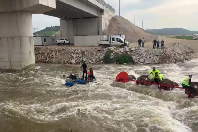 Bursa’nın Yenişehir ilçesinde Kocasu Deresi’nden traktörle karşıya geçmek isteyen 10 işçinin bulunduğu traktör, suyun ortasında devrildi. Akıntının etkisiyle dengesini kaybeden traktördeki işçiler dere içinde mahsur kaldı.