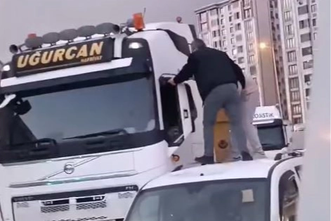 O anları ise kameraya yansıdı. Olay, dün akşam saatlerinde Esenyurt Yeşilkent Mahallesi'nde yaşandı. Bir araç sürücüsü ile tır şoförü arasında yol verme nedeniyle trafikte tartışma çıktı. Kısa sürede büyüyen olayda iki şahıs, araçtan inerek tırın tavanına çıktı. Tır şoförüne tekmelerle saldıran şahısların o anlar ise bir vatandaşın cep telefonunu kamerasına yansıdı.