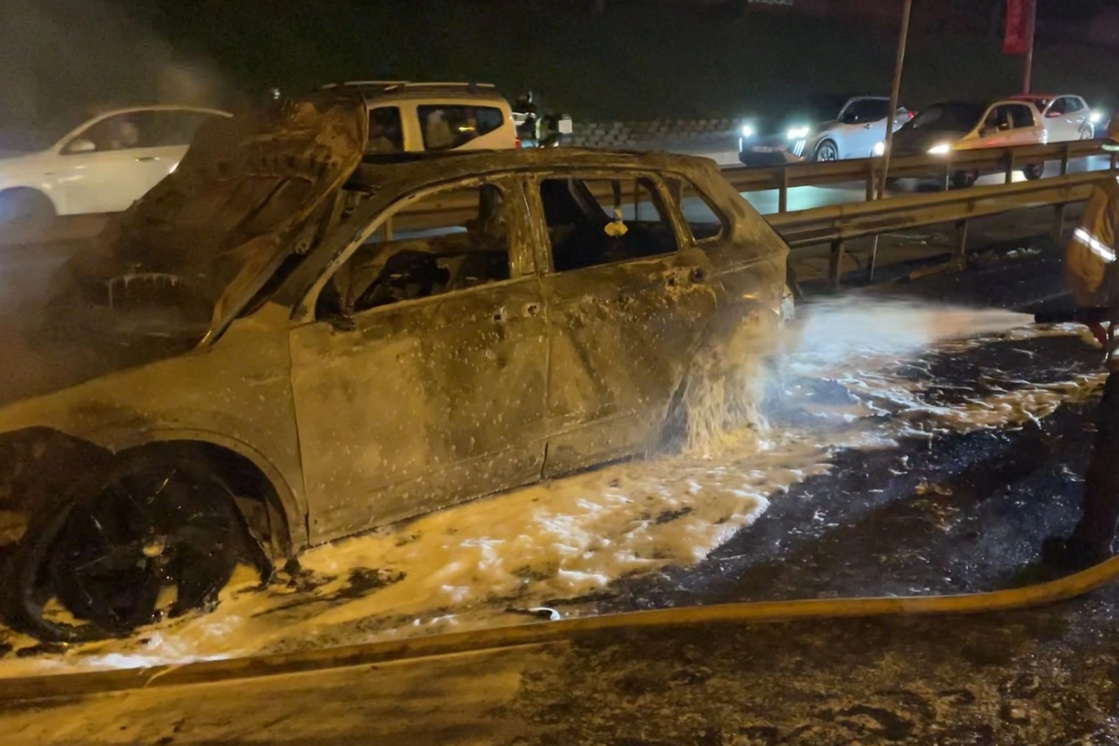 Henüz bilinmeyen bir nedenle çıkan yangını gören sürücü, otomobili emniyet şeridine çekerek yanındaki kişiyle araçtan inip ihbarda bulundu. İhbar üzerine olay yerine gelen polis ekipleri, araç çevresinde güvenlik önlemleri alırken, yangın itfaiye ekiplerinin müdahalesi sonrasında kısa sürede söndürüldü.
