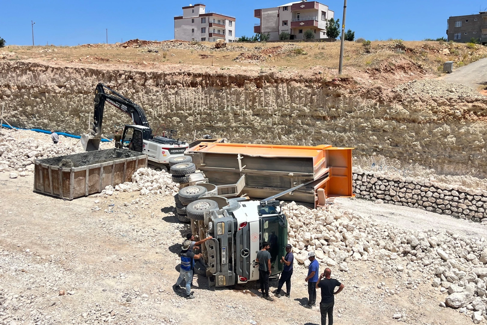 Adıyaman’ın Besni ilçesinde yük boşaltma sırasında kontrolden çıkan kamyon devrildi.