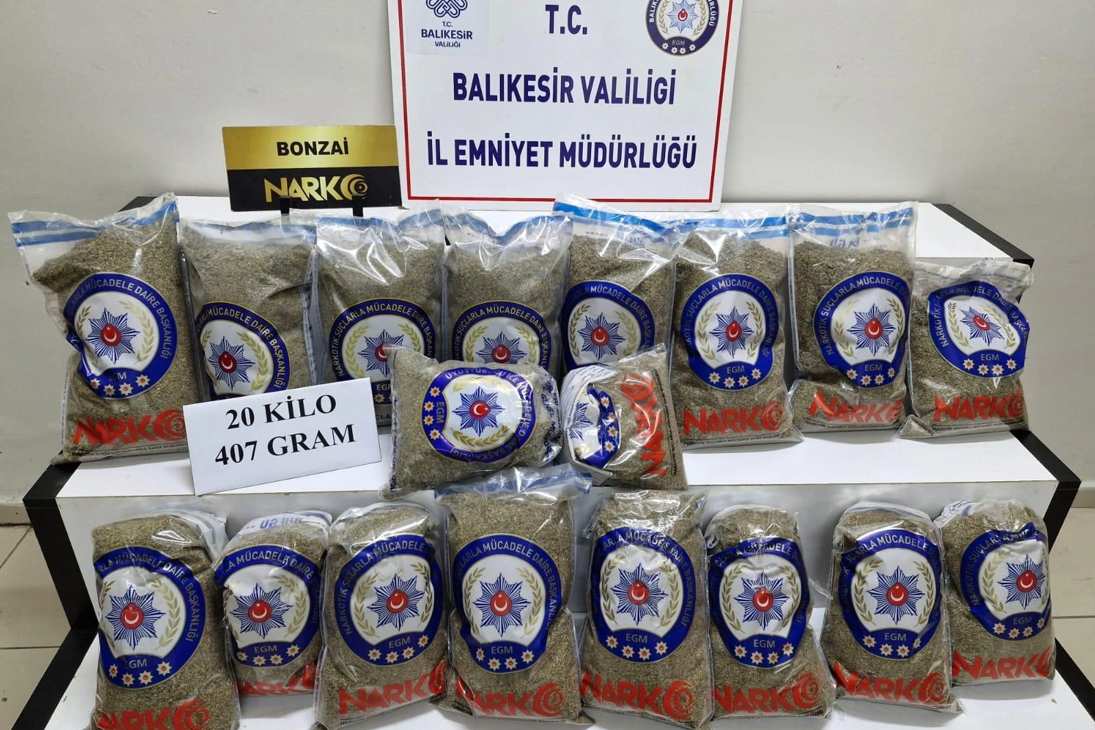 Edinilen bilgiye göre, Balıkesir İl Emniyet Müdürlüğü Edremit Narkotik Suçlarla Mücadele birimlerince yapılan çalışmada M.A(65) ve İ.D (60) yolucu otobüsünde seyahat ederken arama yapıldı. 2 şahsın üzerinde ve eşyalarında yapılan aramada toplam 20 kilo 407 gram Sentetik Kannabinoid (Bonzai) Maddesi Ele geçirilmiş, Şüpheliler yanlarındaki maddenin çay olduğunu iddia etselerde narkotik köpeği Yaşa uyuşturucu maddeyi kısa sürede tespit etti. Şahıslar hakkında tahkikat başlatıldı.